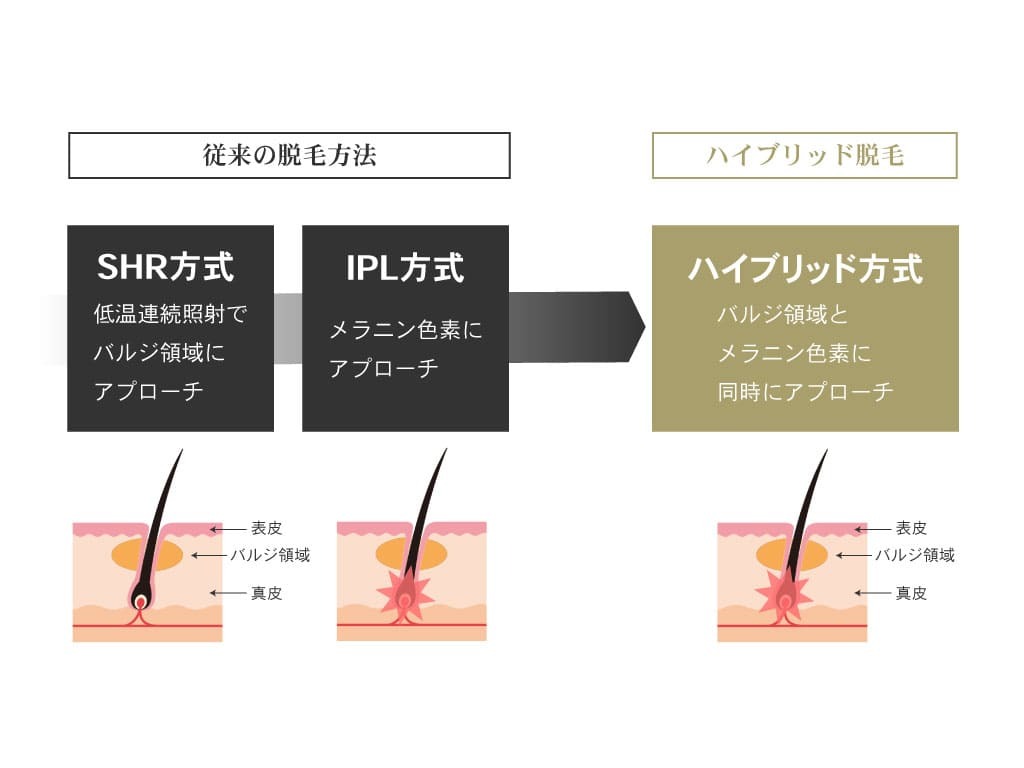 従来の脱毛方式ですと、バルジ領域を狙う「SHR方式」もしくは毛乳頭を狙う「IPL方式」のどちらか片方の方式しか選択できませんでした。